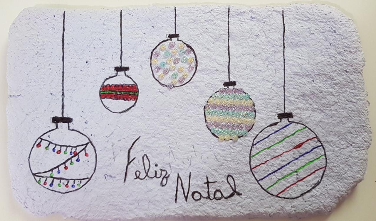 Durante a aula, os alunos enviavam as fotos do procedimento e posteriormente os resultados. Depois de pronto o papel, eles usaram o material e confeccionaram cartões de Natal para presentear um amigo ou familiar.