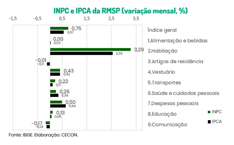 Nos últimos 12 meses, o INPC da RMSP acumulou aumento de 6,06%, novamente uma inflação maior do que a observada no IPCA, no mesmo período, de 5,83%. Logo, o custo de vida no período aumentou mais para as famílias que possuem, em média, uma renda menor.