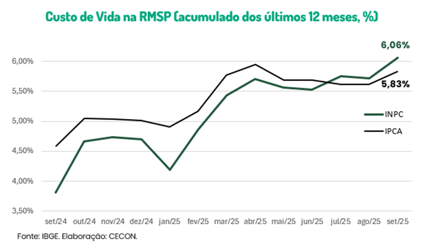 Em setembro de 2025, o Índice Nacional de Preços ao Consumidor (INPC), da Região Metropolitana de São Paulo (RMSP), que reflete a variação no custo de vida das famílias com rendimentos de 1 a 5 salários mínimos, subiu 0,75%, segundo dados apurados pelo Instituto Brasileiro de Geografia e Estatística (IBGE). O IPCA (Índice Nacional de Preços ao Consumidor Amplo), no mesmo período, foi de +0,57%.