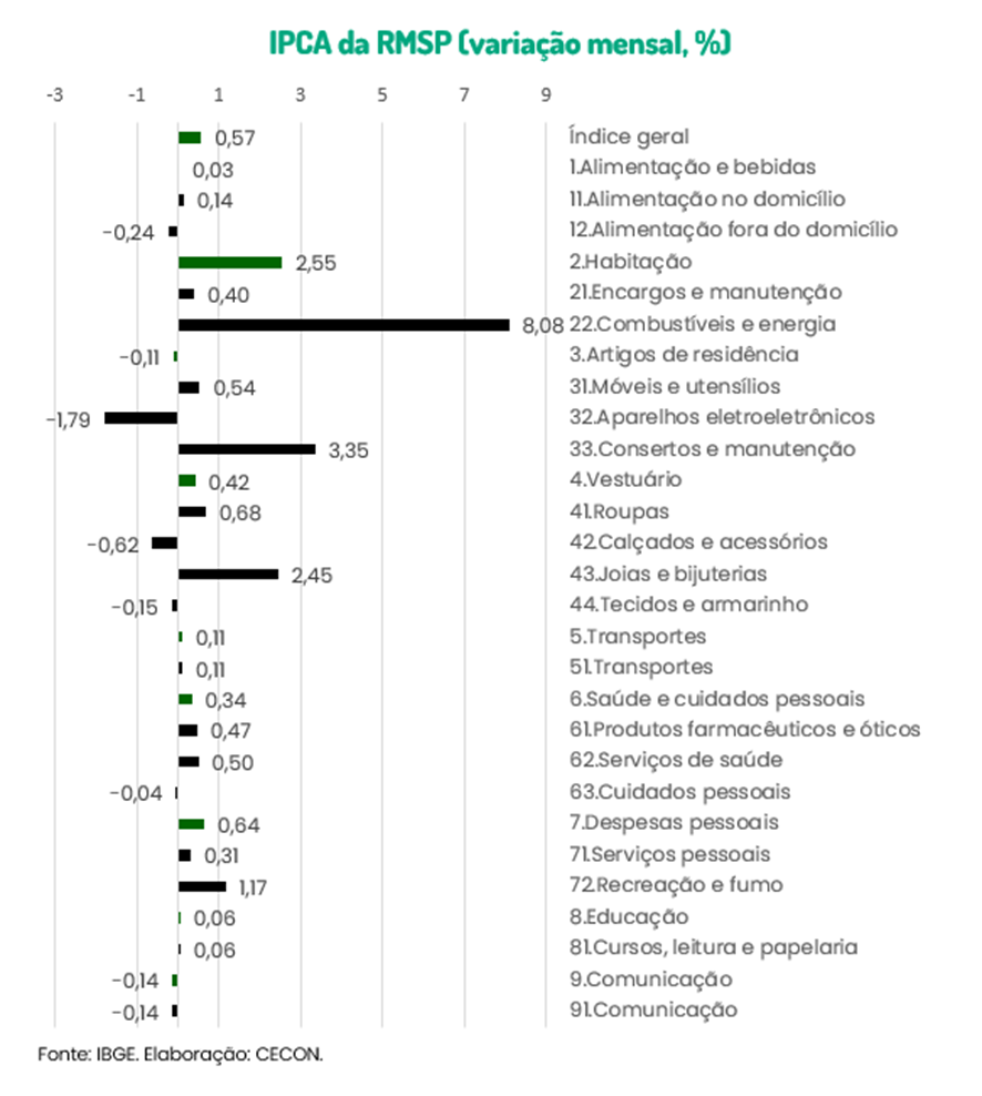 Na divisão mais detalhada por item, dentre os maiores aumentos, estão a energia elétrica residencial (+10,62%), o cinema, teatro e concertos (+4,35%), o pacote turístico (+3,39%) e o óleo de soja (+3,12%). Por outro lado, dentre as maiores reduções, estão o fogão (-5,61%), o ovo de galinha (-3,89%), o azeite de oliva (-2,42%) e o arroz (-2,20%).