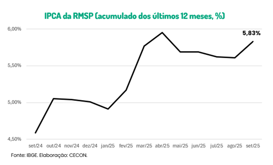 Em setembro de 2025, o Índice de Preços ao Consumidor Amplo (IPCA), da Região Metropolitana de São Paulo (RMSP), que reflete a variação no custo de vida das famílias com rendimentos de 1 a 40 salários mínimos, subiu 0,57% em relação ao mês anterior, segundo dados apurados pelo Instituto Brasileiro de Geografia e Estatística (IBGE). Para o País, a variação no custo de vida foi de +0,48%.