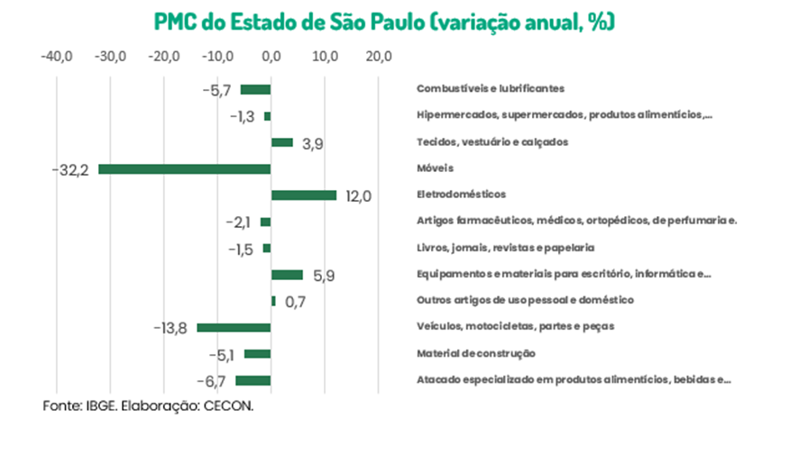 Dentro do setor varejista paulista, os destaques positivos ficaram para os setores de eletrodomésticos (+12,0%) e de equipamentos e materiais para escritório, informática e comunicação (+5,9%). Por outro lado, as piores performances ficaram para os setores de móveis (-32,2%) e de veículos, motocicletas, partes e peças (-13,8%).