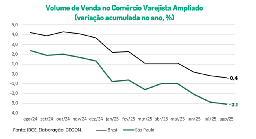 No acumulado de janeiro a agosto, o volume de vendas do comércio varejista ampliado de São Paulo caiu 3,1% em comparação ao mesmo período do ano anterior, uma queda muito maior do que a observada para o País (-0,4%).