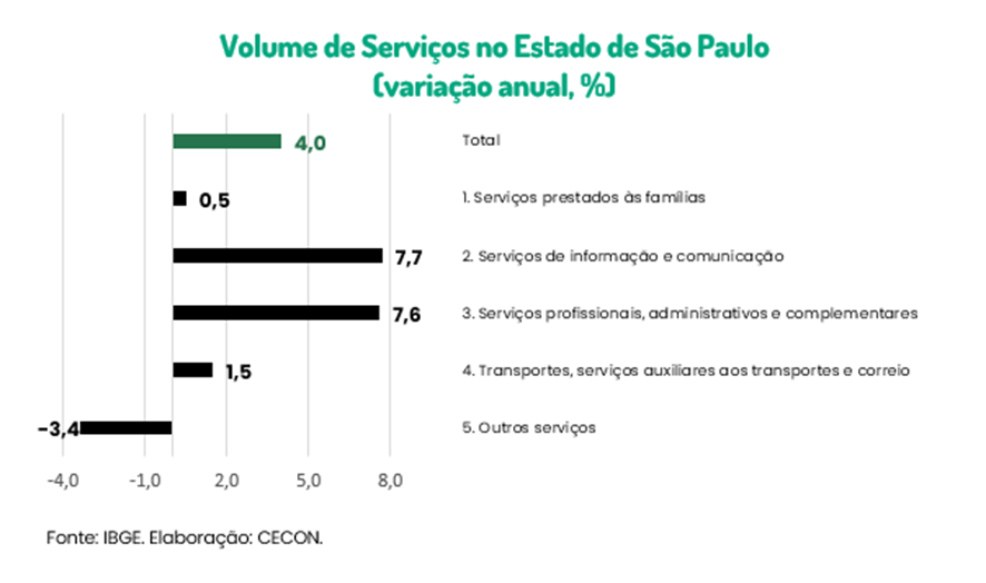 O principal resultado positivo ficou para o setor de serviços de informação e comunicação (+7,7%), enquanto o maior resultado negativo ficou para os outros serviços (-3,4%).