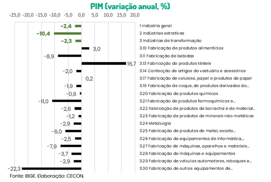 Dentro dos 24 setores da indústria de transformação, 7 apresentaram crescimento, enquanto 10 recuaram e 7 não tiveram dados disponíveis.