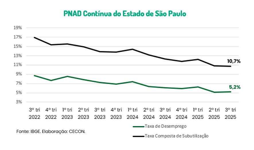 No terceiro trimestre de 2025, a Pesquisa Nacional por Amostra de Domicílios Contínua (PNAD Contínua), realizada pelo Instituto Brasileiro de Geografia e Estatística (IBGE), registrou uma redução de 37 mil postos de trabalho no Estado de São Paulo, mas sem variação estatisticamente significativa em relação ao trimestre anterior. A força de trabalho diminuiu, mas também sem variação estatisticamente significativa. Assim, a taxa de desemprego atingiu 5,2%, com ajuste sazonal, o que representou um aumento de 0,1 ponto percentual (p.p.) em relação ao trimestre anterior.