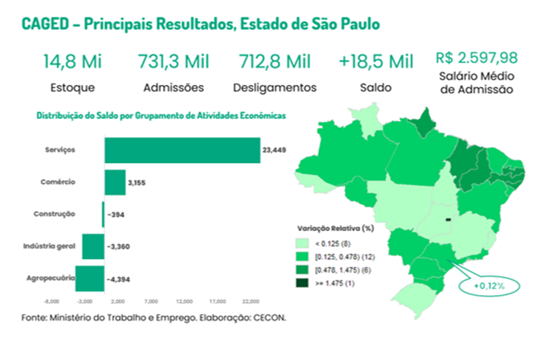 Com base no Novo Caged (Cadastro Geral de Empregados e Desempregados), em outubro de 2025, o emprego formal no Estado de São Paulo apresentou saldo positivo de 18.456 postos de trabalho, o que representou um aumento de 0,12% no estoque em relação ao mês anterior. Os maiores aumentos ocorreram no Distrito Federal (+1,47%) e em Alagoas (+0,97%), ao passo que Mato Grosso (-0,18%) e Acre (-0,15%) apresentaram variações negativas.