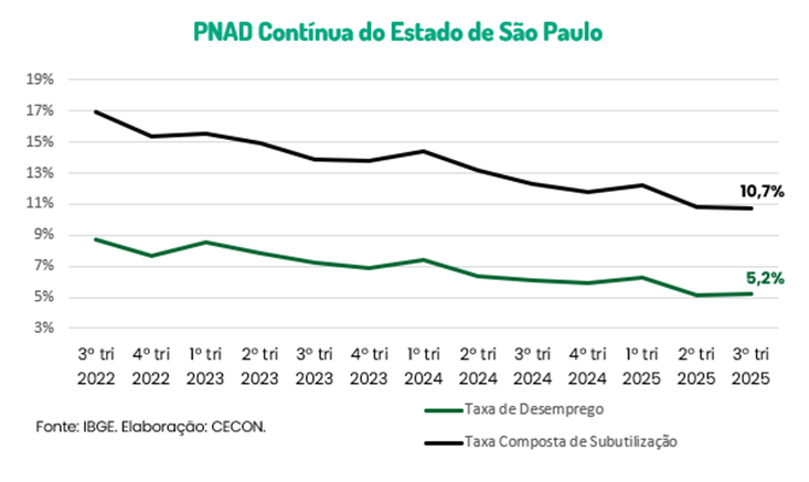 Em novembro, também foi divulgada a Pesquisa Nacional por Amostra de Domicílios Contínua (PNAD Contínua) do terceiro trimestre de 2025, realizada pelo IBGE. De acordo com a pesquisa, a taxa de desemprego no Estado de São Paulo atingiu 5,2%, o que representa uma diminuição de 0,8 ponto percentual (p.p.) em relação ao terceiro trimestre de 2024. A taxa de desemprego estimada para o Brasil foi de 5,6%.