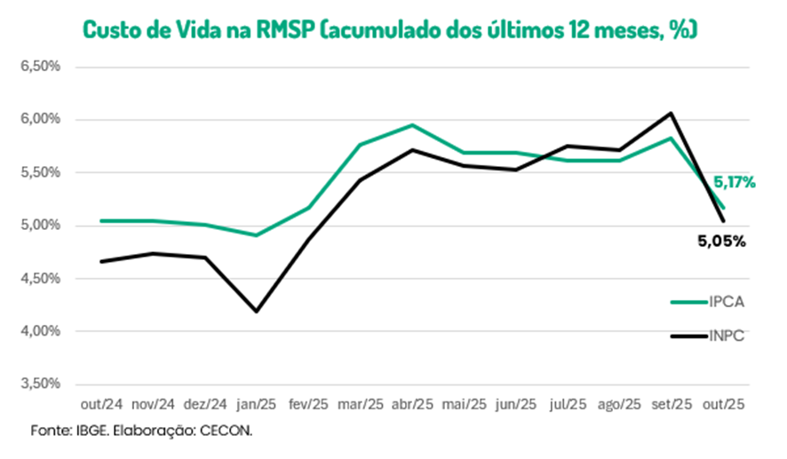 Já a inflação medida pelo INPC apresentou uma variação mensal negativa pela terceira vez no ano. Na variação acumulada dos últimos 12 meses, após três meses consecutivos com inflação superior à observada no IPCA, o índice voltou a ficar abaixo. Logo, o custo de vida na RMSP aumentou menos para as famílias que possuem, em média, renda menor.