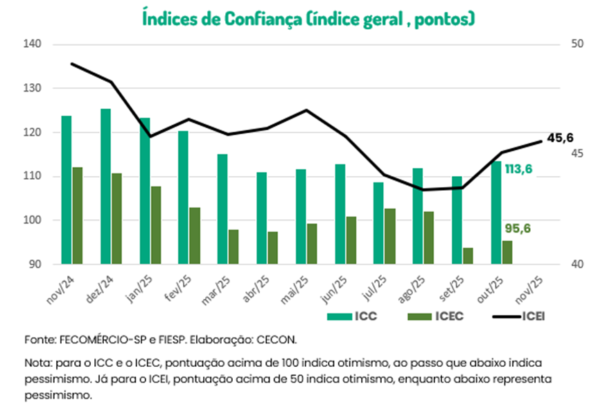 O Índice de Confiança do Empresário Industrial Paulista (ICEI-SP), calculado pela Federação das Indústrias do Estado de São Paulo (FIESP), em parceria com a Confederação Nacional da Indústria (CNI), registrou, em novembro de 2025, uma alta de 1,1% em relação ao mês anterior. O indicador ainda evidencia pessimismo entre os empresários. No entanto, a alta no indicador representa uma diminuição desse pessimismo. Na comparação com o mesmo mês do ano anterior (novembro de 2024), o índice registrou uma queda de 7,1%. O subindicador que reflete as condições atuais teve uma redução de 7,3%, e o subindicador que reflete as expectativas para os próximos seis meses teve uma redução de 5,1%.