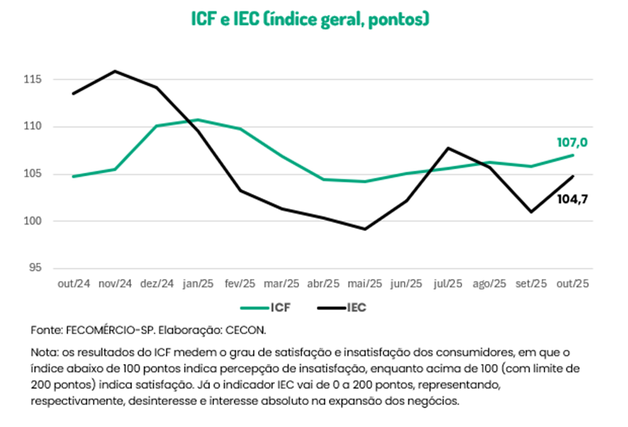 Em outubro de 2025, o Índice de Confiança do Consumidor (ICC), calculado pela FECOMÉRCIO-SP, registrou uma alta de 3,1% em relação ao mês anterior. Na comparação com o mesmo mês do ano anterior (outubro de 2024), o índice registrou uma queda de 6,1%. Para consumidores com até 35 anos de idade, o nível de confiança diminuiu 7,7%, enquanto, para os consumidores com mais de 35 anos, diminuiu 3,0%. O subindicador que reflete a percepção dos consumidores em relação às condições atuais teve uma queda de 3,5%, enquanto o subindicador que reflete as suas expectativas caiu 7,6%.