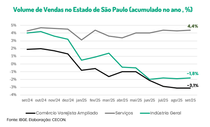 Em setembro de 2025, o volume de vendas no comércio varejista ampliado no Estado de São Paulo, medido pelo Instituto Brasileiro de Geografia e Estatística (IBGE), registrou queda de 1,6% em relação ao mês anterior. No acumulado de janeiro a setembro, o volume de vendas do comércio varejista ampliado paulista caiu 3,1%, o que é muito maior do que a observada no País (-0,3%). As maiores variações ocorreram no Amapá (+6,9%), na Paraíba (+5,1%), no Maranhão (-2,0%) e em Goiás (-2,6%). E dentro das subcategorias analisadas pelo IBGE, os destaques negativos foram o setor de móveis (-23,1%), o de atacado especializado em produtos alimentícios, bebidas e fumo (-15,8%) e o de veículos, motocicletas, partes e peças (-6,2%), enquanto os destaques positivos foram os equipamentos e materiais para escritório, informática e comunicação (+14,4%), os eletrodomésticos (+9,3%) e os tecidos, vestuário e calçados (+6,0%).