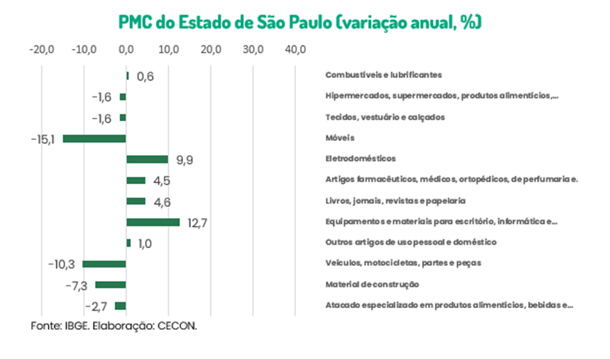 Dentro do setor varejista paulista, os destaques positivos ficaram para os equipamentos e materiais para escritório, informática e comunicação (+12,7%) e para os eletrodomésticos (+9,9%). Por outro lado, as piores performances ficaram para os móveis (-15,1%), os veículos, motocicletas, partes e peças (-10,3%) e material de construção (-7,3%).