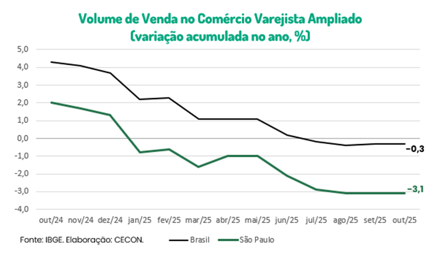 No acumulado de janeiro a outubro, o volume de vendas do comércio varejista ampliado caiu 3,1% em comparação ao mesmo período do ano anterior, uma queda muito maior do que a observada no país (-0,3%).