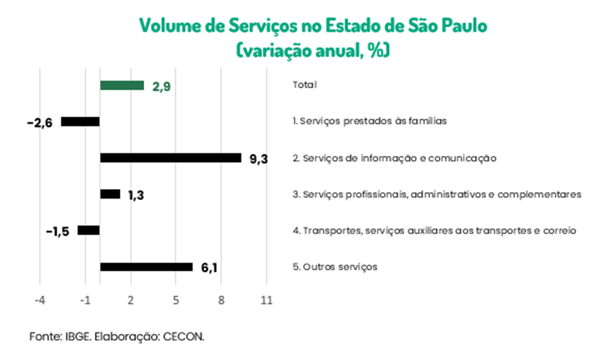 Os destaques ficaram para os setores de serviços de informação e comunicação (+9,3%) e de serviços prestados às famílias (-2,6%).