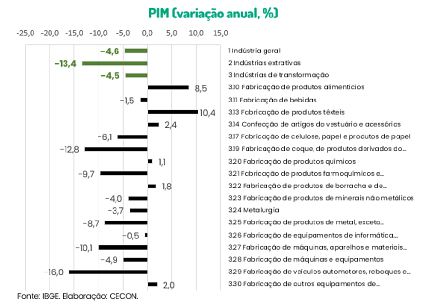 Já as maiores quedas ficaram nos setores de fabricação de veículos automotores, reboques e carrocerias (-16,0%) e de fabricação de coque, de produtos derivados de petróleo e de biocombustíveis (-12,8%)