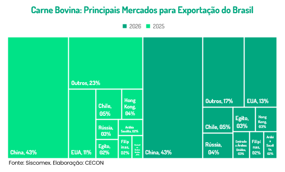 Apesar da expansão em mercados alternativos, a dependência estrutural em relação a poucos parceiros comerciais se manteve. A China continua sendo, de longe, o principal destino da carne bovina brasileira, absorvendo 42,9% das exportações neste primeiro bimestre, ligeiramente abaixo dos 43,5% registrados no ano passado.