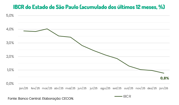 O Índice de Atividade Econômica Regional do Banco Central (IBCR), que mede a evolução conjunta dos setores produtivos da economia (comércio, serviços, indústria e agropecuária), é divulgado mensalmente pelo Banco Central (BC), e ajuda na definição da taxa básica de juros pelo Comitê de Política Monetária (Copom). Ele também serve como “prévia” do PIB, embora tenha uma metodologia diferente. Na comparação com o mesmo mês do ano anterior (janeiro de 2025), a atividade econômica no Estado de São Paulo cresceu 0,7%. Já no acumulado dos últimos 12 meses, o crescimento no Estado foi de 0,8%, bem abaixo da média nacional de 2,3%. Na divisão por região, o crescimento foi de 5,4% no Centro-Oeste, 3,0% no Norte, 2,6% no Nordeste, 2,0% no Sul e 1,8% no Sudeste.