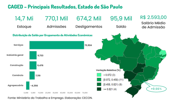 Com base no Novo Caged (Cadastro Geral de Empregados e Desempregados), em fevereiro de 2026, o emprego formal no Estado de São Paulo apresentou saldo positivo de 95.896 postos de trabalho, o que representou um aumento de 0,66% no estoque em relação ao mês anterior, resultado superior à média do Brasil, de +0,53%. No entanto, o salário médio de admissão diminuiu 4,60% e atingiu R$2.593,00, uma queda maior do que a observada na média do País, de -2,33%.