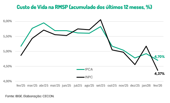 Segundo o IBGE, em fevereiro de 2026, o Índice de Preços ao Consumidor Amplo (IPCA) da Região Metropolitana de São Paulo (RMSP), que reflete a variação no custo de vida das famílias com rendimentos de 1 a 40 salários-mínimos (SM), subiu 0,97% em relação ao mês anterior. Para o País, o variação no custo de vida foi de +0,70%. Na divisão mais detalhada por item, entre os maiores aumentos, estão a passagem aérea (+16,92%), o feijão carioca (+11,43%), o seguro voluntário de veículo (+5,35%) e o transporte por aplicativo (+3,01%). Por outro lado, dentre as maiores reduções, estão o caderno (-3,58%), o cinema, teatro e concertos (-3,56%), o ar-condicionado (-3,37%) e o azeite de oliva (-3,29%). Vale destacar também alguns itens que compõem o grupo educação, dada a variação de preços muito acima da média. Os destaques ficaram para o ensino médio (+8,36%), o ensino fundamental (+8,32%), a pré-escola (+7,98%), a creche (+6,94%) e o ensino superior (+4,51%).