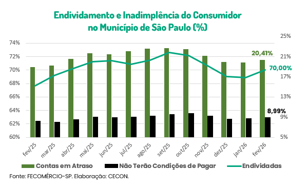Em fevereiro de 2026, a Pesquisa de Endividamento e Intenção de Consumo das Famílias (PEIC-SP), realizada pela FECOMÉRCIO-SP, apontou que o percentual de famílias endividadas atingiu 70,00%, um aumento de 1,11 ponto percentual (p.p.) em relação ao mês anterior e de 2,30 p.p. em comparação a fevereiro de 2025. Para as famílias com renda até dez salários-mínimos (SMs), o percentual é de 73,53%, enquanto para as famílias com renda maior de dez SMs, 59,77%.