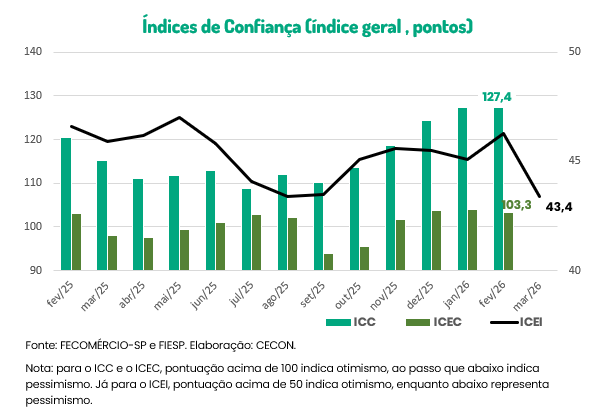 O Índice de Confiança do Empresário Industrial Paulista (ICEI-SP), calculado pela Federação das Indústrias do Estado de São Paulo (FIESP), em parceria com a Confederação Nacional da Indústria (CNI), registrou, em março de 2026, uma queda de 6,3% em relação ao mês anterior. O indicador evidencia um aumento no pessimismo entre os empresários. Na comparação com o mesmo mês do ano anterior (março de 2025), o índice registrou uma queda de 5,5%. O subindicador que reflete as condições atuais apresentou redução de 5,9%, enquanto o subindicador que reflete as expectativas para os próximos seis meses diminuiu 2,7%.