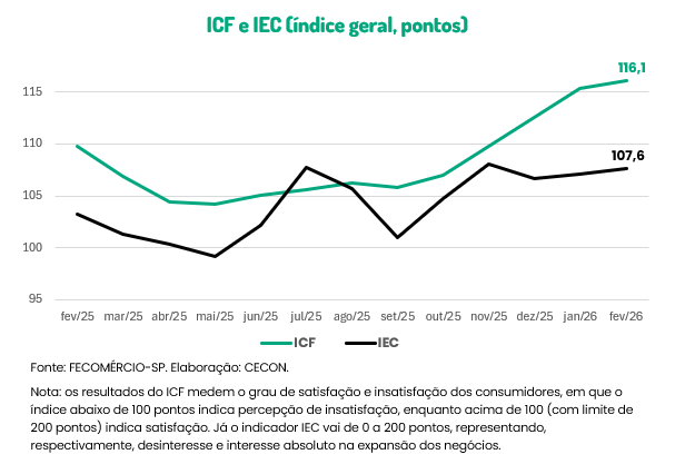 Em fevereiro de 2026, o Índice de Confiança do Consumidor (ICC), calculado pela FECOMÉRCIO-SP, não apresentou variação em relação ao mês anterior. Já na comparação com o mesmo mês do ano anterior (fevereiro de 2025), o índice subiu 5,7%. Para consumidores com até 35 anos de idade, o nível de confiança aumentou 4,1%, enquanto para aqueles com mais de 35 anos, aumentou 8,6%. Para as mulheres, o nível de confiança aumentou 2,4%, enquanto, para os homens, aumentou 9,2%. O subindicador que reflete a percepção dos consumidores em relação às condições atuais teve uma alta de 2,4%, enquanto o subindicador que reflete as suas expectativas subiu 7,9%.