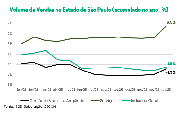 O volume de serviços no Estado de São Paulo iniciou 2026 com o mesmo comportamento observado em 2025: uma variação positiva, maior do que a registrada no Brasil.