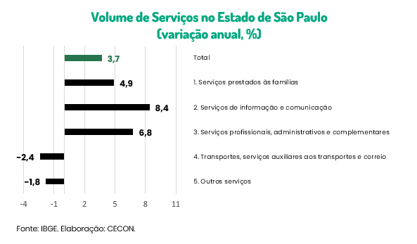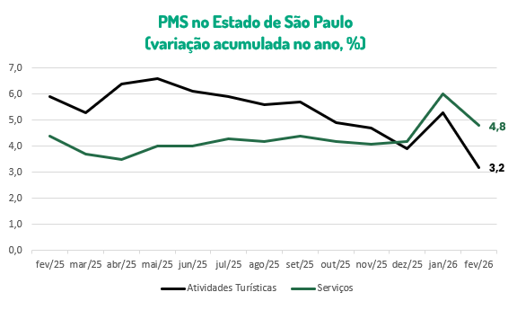 O resultado acumulado nos últimos doze meses no setor de serviços no Estado de São Paulo foi de +4,3%, e no setor das atividades turísticas, de +3,5%.